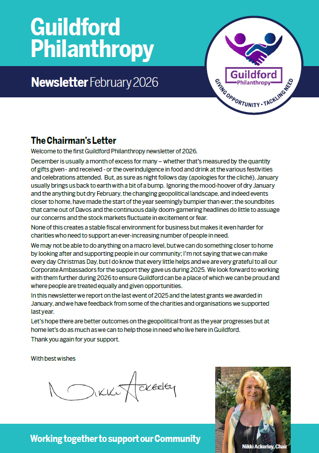 Guildford Philanthropy is powered solely by volunteers who kindly give their time and expertise, and apart from a small admin fee to the Community Foundation of Surrey, all donations go to support good causes.