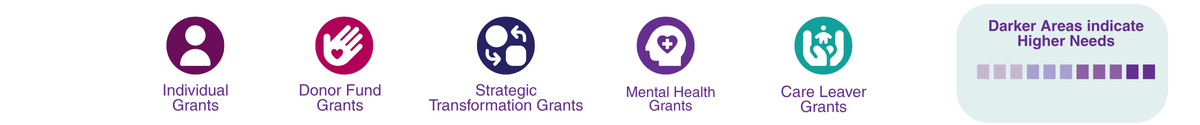 This map below shows a ‘heat map’ of all needs data. We have mapped onto it Grants awarded by CFSurrey in financial year 2024-25. You can search the map by area, by our Grant Programmes (see key below), and also by beneficiaries and issues. Note that the Primary Grant Beneficiary groups and Issues are chosen by the grant applicant at the time of applying for funding.